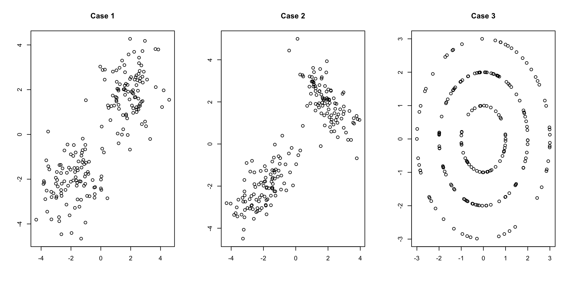 For now, let us focus on the the latter question regarding similarity. Consider the following three examples of data sets in \(\mathbb{R}^2\). Visually, how would you cluster the observations? In particular, how many subgroups would you say exist and how would your partition the data into these subgroups?
