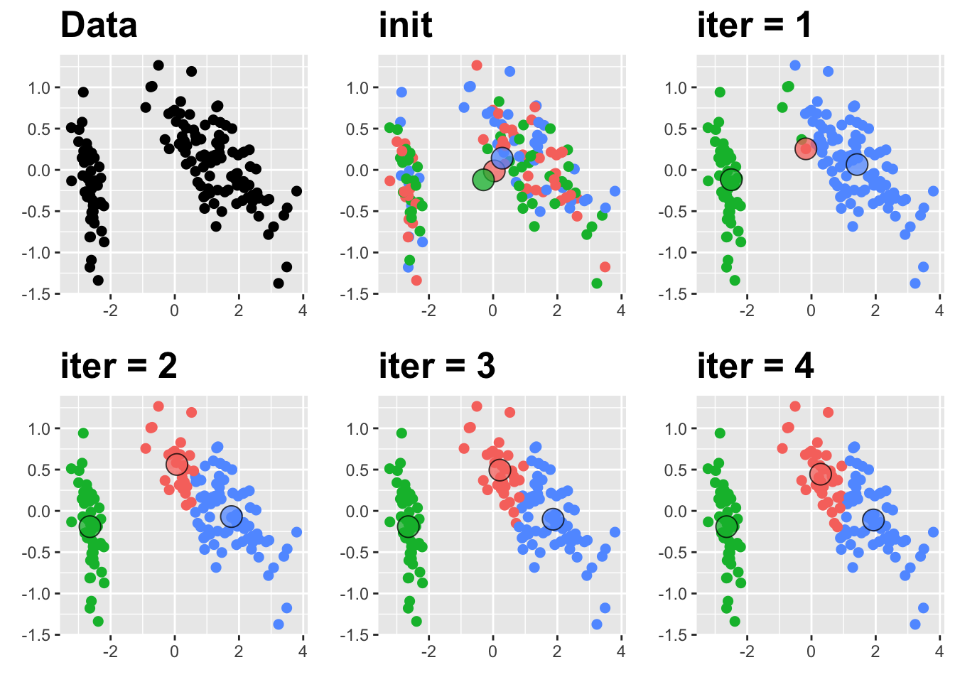 For any of the three preceding methods, we want to find an optimal partitioning and/or set of centers which minimize their associated loss. One naive approach would be to search or all possible partitioning of our data into \(k\) clusters (\(k\)-means) or all possible choices of \(k\) center points from our data, but one can imagine how computationally unfeasible this approach becomes for even moderate amounts of data. Instead, we will turn to greedy, iterative algorithms which converge to (locally) optimal solutions. The standard approach for \(k\)-means is based on Lloyd’s algorithm with a special initialization to avoid convergence to local minima. Later versions of this text will discuss greedy approaches for \(k\)-center and the standard partitioning around medians (PAM) algorithm for \(k\)-medoids.