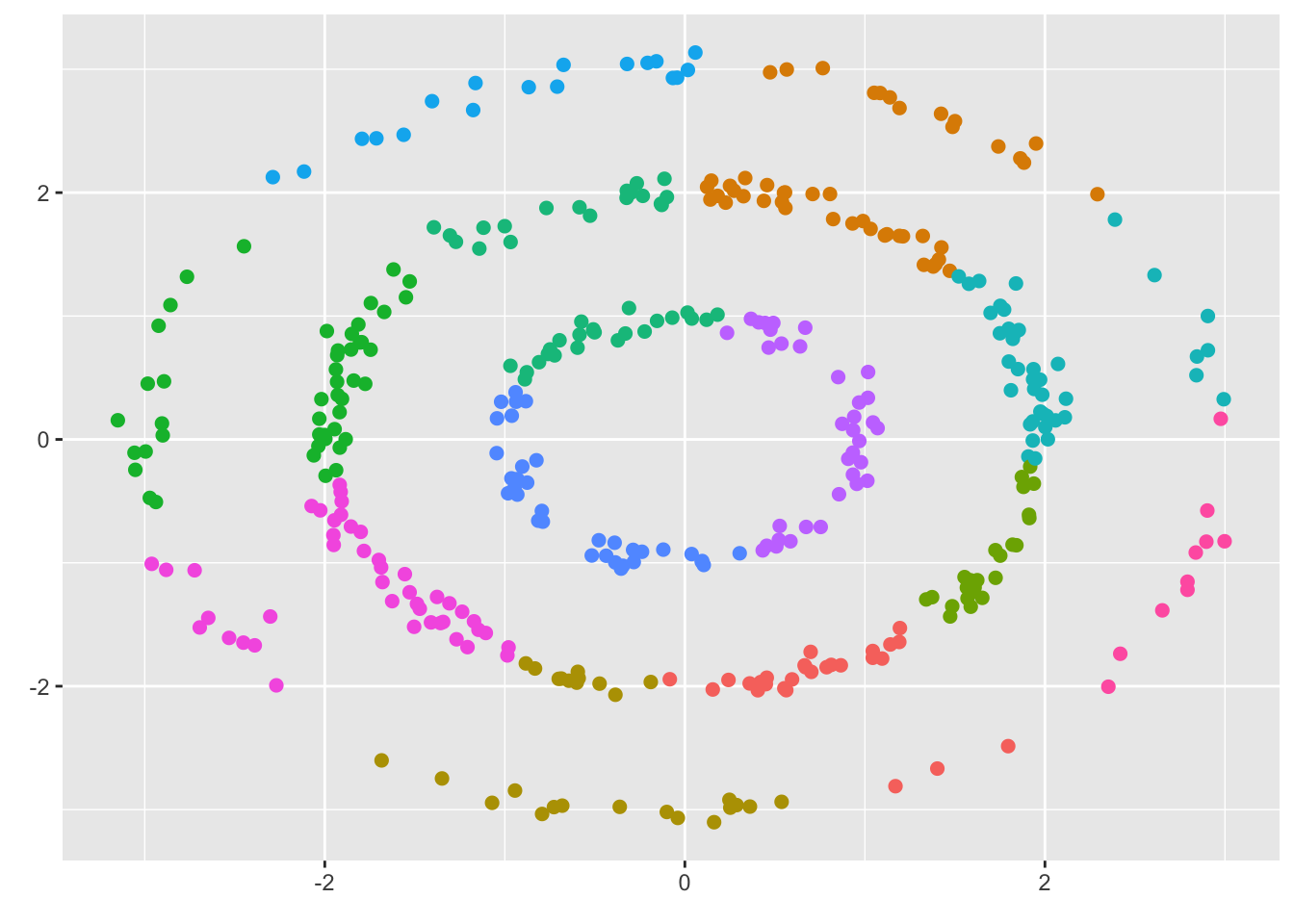 Clusters are based off interpretable notion of (Euclidean) distance so that points in a cluster are closer to one another than to points in other clusters. However, this feature biases center-based methods to clusters which are spherical in shape. If (dis)similarity not best captured through (squared) Euclidean distance, poor clustering is inevitable, and many of the methods used to estimate the number of cluster with tend to overestiamte the true value. As an example, consider the three rings shown at the beginning of this chapter. Silhouette scores (see 6.1.) suggest 12 clusters which is much larger than the three rings we see in the figure.