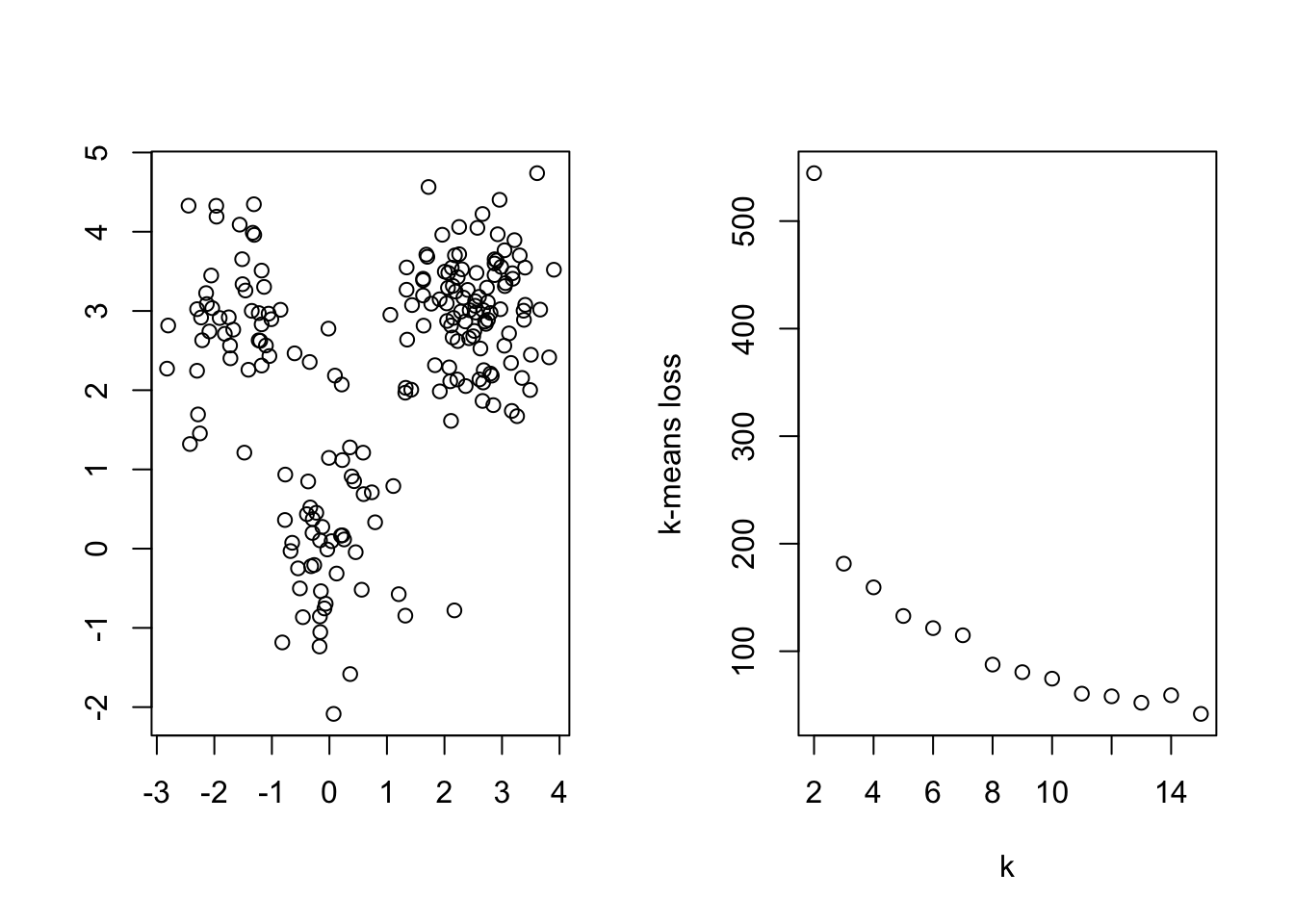 The center-based loss function will decrease as the number of clusters increases. Thus, we can plot the optimal loss found at different numbers of clusters and look for a sudden drop, much like we did with the scree plot in PCA. Below, we show an example of this method for data with three well separated spherical clusters