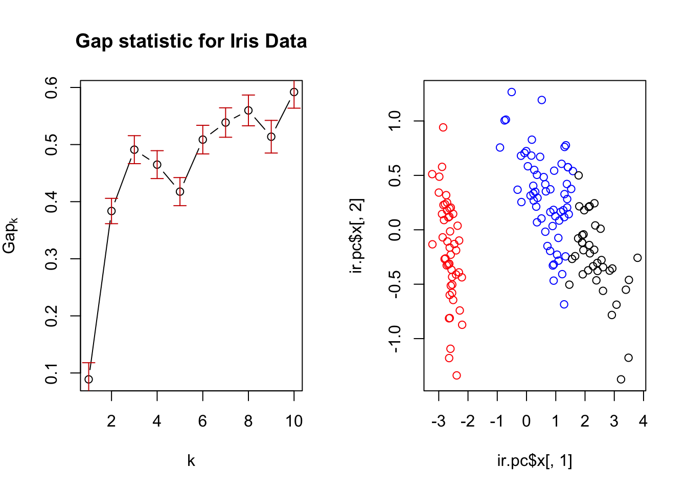 Finally, choose the number of clusters as the smallest K such that \[Gap(K) \ge Gap(K+1) - s_{K+1}\] ::: {.example name=“GAP statistic and iris data”} Below, we show a plot of the Gap Statistic (left) which indicates that three clusters is correct. The associated clustering is used to color a plot of the first two PC scores (right)