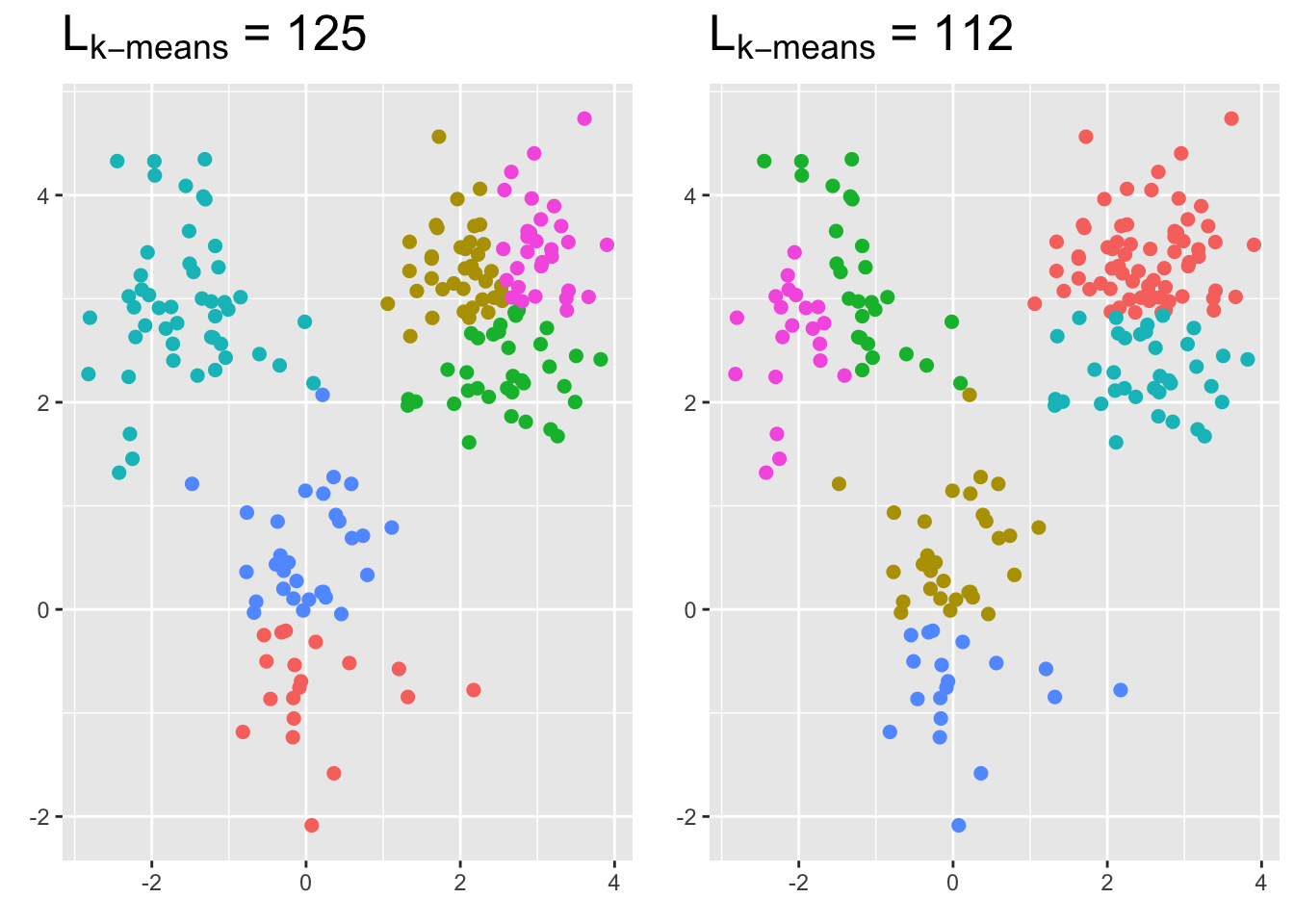 In \(k\)-means, we want all clusters to have small intracluster variation so a natural loss function is the sum of all intracluster variations \[L_{kmeans}(C_1,\dots,C_k) = \sum_{\ell=1}^k V(C_\ell).\] With a little algebra, one can show that \[V(C_\ell) = \sum_{\vec{x}_i\in C_\ell} \|\vec{x}_i-\vec{\mu}_\ell\|^2\] where \(\vec{\mu}_\ell = \frac{1}{|C_\ell|}\sum_{\vec{x}_i \in C_\ell}\) is the sample mean of points in cluster \(\ell.\) Thus, the \(k\) means loss function simplifies to \[T_{kmeans}(C_1,\dots,C_k) = \sum_{\ell=1}^k \sum_{\vec{x}_i \in C_\ell}\|\vec{x}_i-\vec{\mu}_\ell\|^2.\]