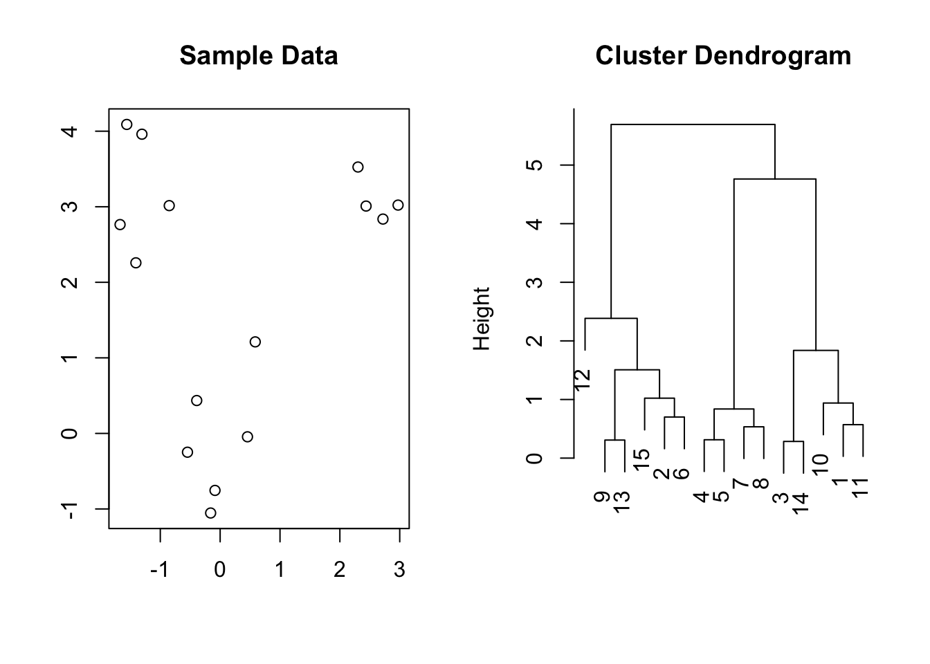 In the figure below, samples 8 and 15 are merged into a cluster at height \(\approx 0.5\) indicating they have an original dissimilarity (Euclidean distance in this case) of 0.5. Sample 4 is then merged into the cluster with samples 8 and 15 at height \(\approx\) indicating the dissimilarity of sample 4 with the cluster of samples 8 and 15 is \(\approx 0.75\)