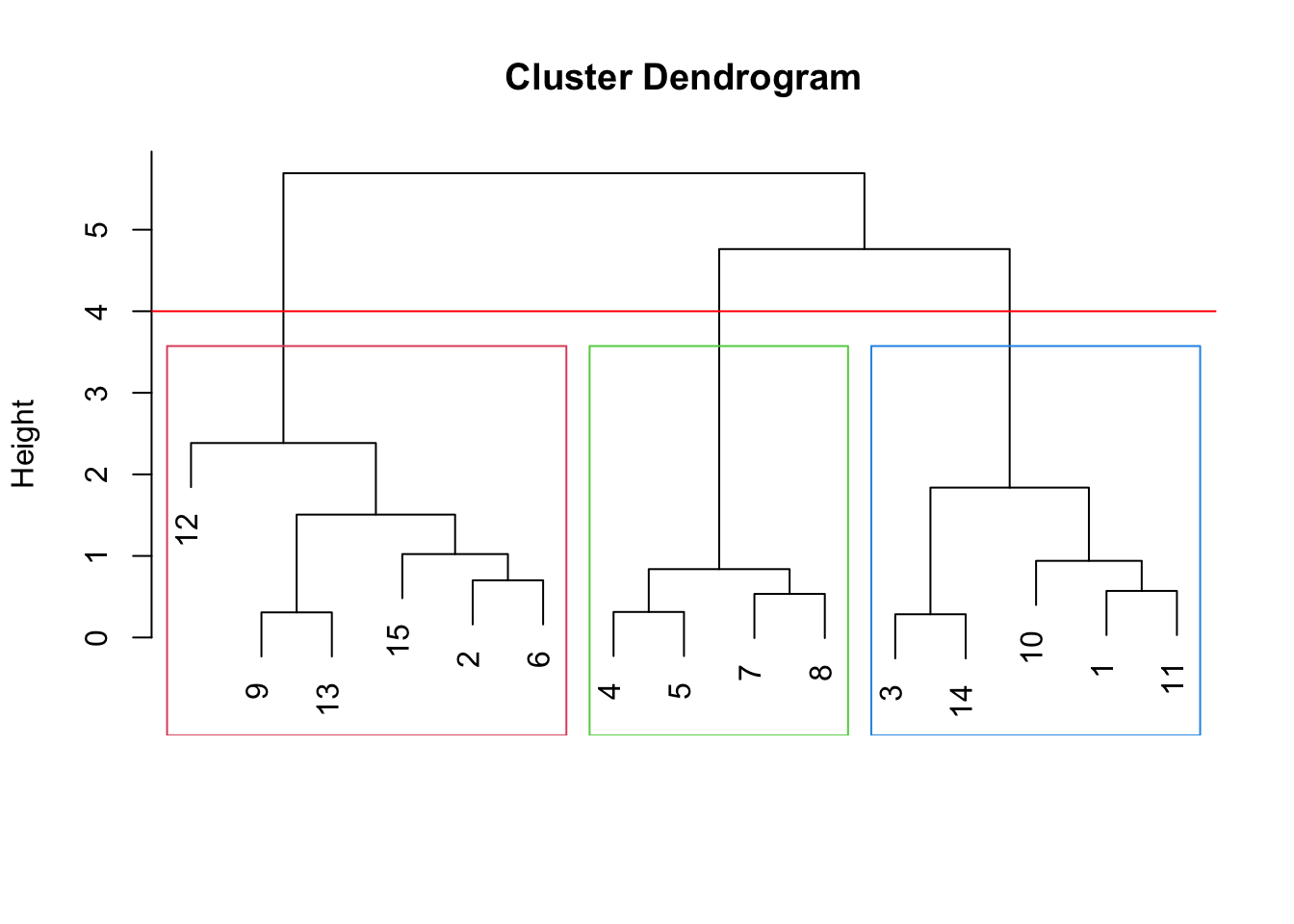 In addition to indicating the subsequent mergings/divisions of our data, the dendrogram can be used to determine a clustering of the data into a chosen number of clusters. For example, to cluster the data into three groups, we draw a horizontal line at a height (four in this case) which only cuts the tree into three branches.
