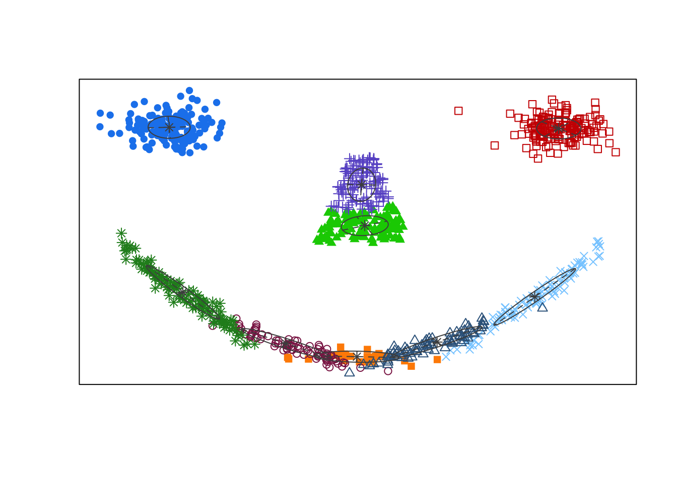 Using BIC, the optimal GMM one should select contains nine clusters with EVV covariance structure. In the associated clustering shown below, the eyes are appropriately clustered, but the nose is split into two separate clusters. Most egregiously though, we can see the mouth was broken apart into five thin elliptic pieces reflecting the inherent limitations of the cluster shapes that can be identified by GMMs.