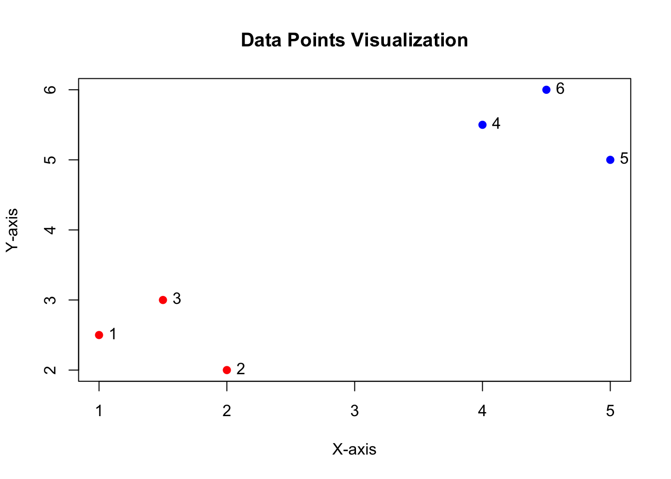 plot(data, col = c(rep("red", nrow(cluster1)), rep("blue", nrow(cluster2))), pch = 19, xlab = "X-axis", ylab = "Y-axis")