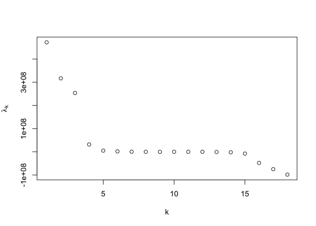 Example 4.5 (Global Cities Revisited) We can also consider the previous global city distance matrix example. Plot the scree plot of the inner product matrix.
