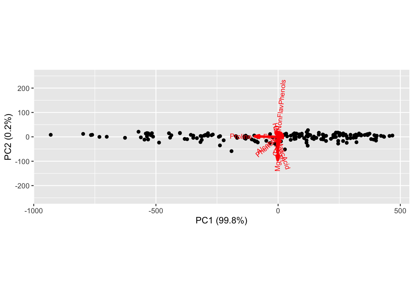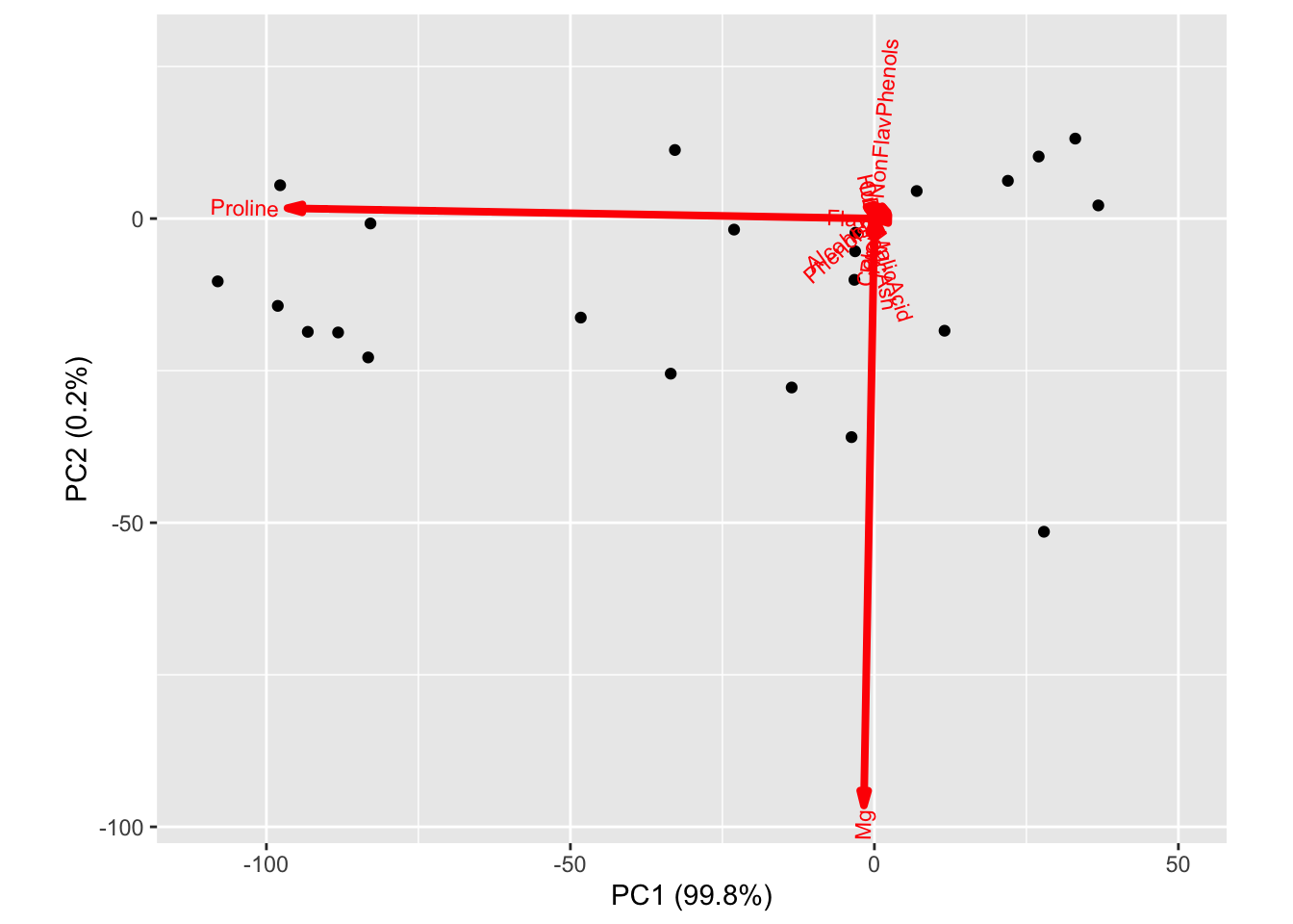Prior to running PCA, we might be able to guess which coordinates account for the most variability. Proline (on the scale of 1000s) and magnesium (on the scale of 100s) have much larger values than other coordinates in the data matrix. We can see this observation holds out immediately when looking at the biplot summarizing PCA run on the wine data.