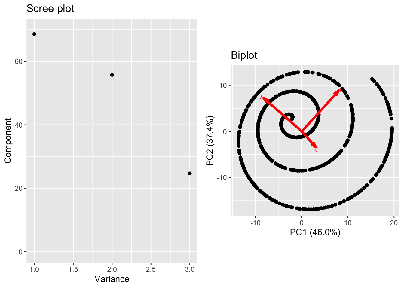 Principal component analysis (PCA) is arguably the first method for dimension reduction, which dates back to papers by some of the earliest contributors to statistical theory including Karl Pearson and Harold Hotelling [6, 7]. Pearson’s original development of PCA borrowed ideas from mechanics which provides a clear geometric/physical interpretation of the resulting PCA loadings, variances, and scores, which we will define later. This interpretability and an implementation that uses scalable linear algebra methods – allowing PCA to be conducted on massive datasets – is one of the reasons PCA is still used prolifically to this day. In fact, many more modern and complex methods still rely on PCA as an internal step in their algorithmic structure.
