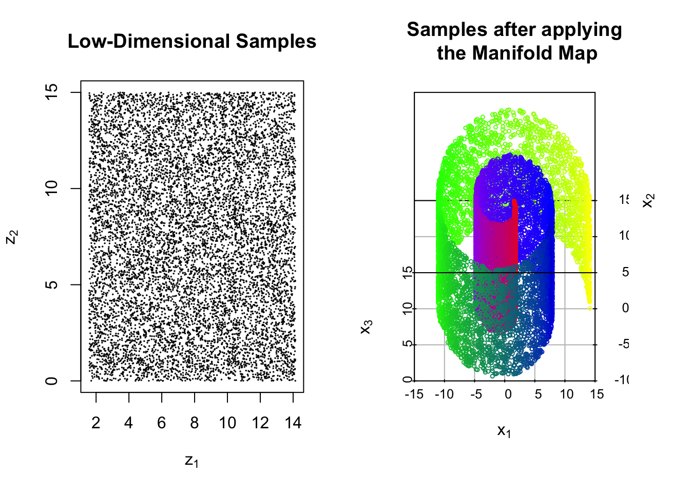 Assume there are points \(\vec{z}_1,\dots,\vec{z}_N\in A \subset \mathbb{R}^t\) which are iid random samples from some probability distribution. These points are (nonlinearly) mapped into a higher dimensional space \(\mathbb{R}^d\) by a smooth map \(\Psi\) giving data \(\vec{x}_i = \Psi(\vec{z}_i)\) for \(i=1,\dots,N.\) Hereafter, we refer to \(\Psi\) as the manifold map. In this setting, we are only given \(\vec{x}_1,\dots,\vec{x}_N\), and we want to recover the lower-dimensional \(\vec{z}_1,\dots,\vec{z}_N\). If possible, we would also like recover \(\Psi\) and \(\Psi^{-1}\) and in the most ideal case, the sampling distribution that generated the lower-dimensional coordinates \(\vec{z}_1,\dots,\vec{z}_N\).