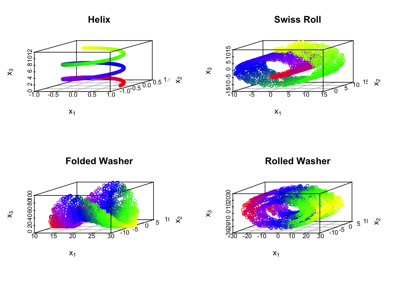 In the following sections, we will provide more background on the mathematical foundation of nonlinear manifolds. Specifically, what is a manifold (and what is not) and what do we mean by intrinsic dimensionality. We’ll also touch on important properties which guides the assumptions used by various methods of nonlinear dimension reduction. For now, let’s discuss a simple mechanism for generating data on a manifold.