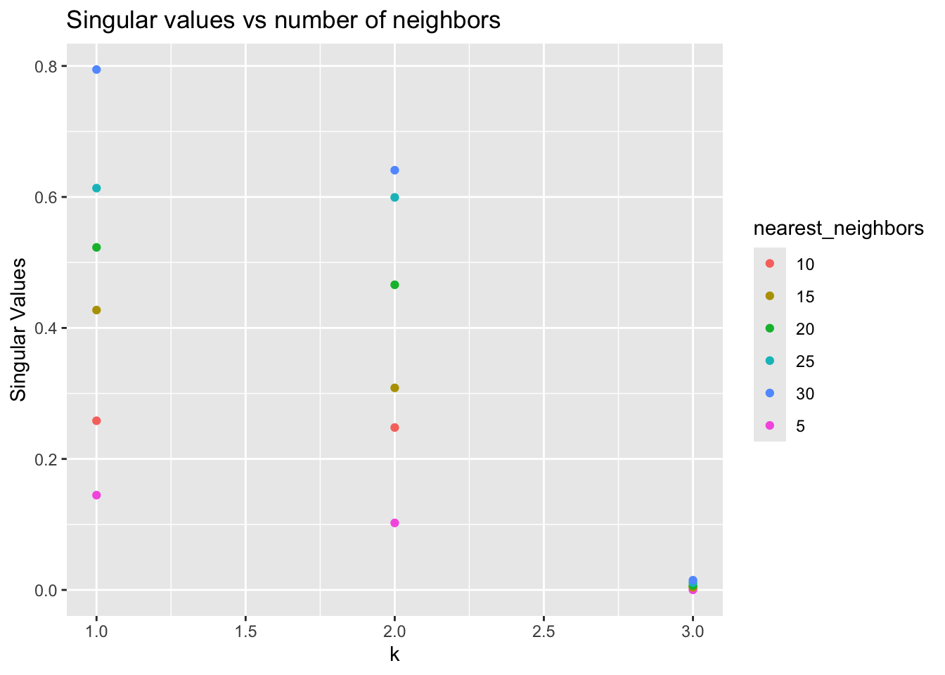 Let \(\Phi:\mathbb{R}^t\to\mathbb{R}^t\) be an invertible function. As an example, you could think of \(\Phi\) as defining a translation, reflection, rotation, or some composition of these operations akin to the nonuniqueness issue we addressed in classical scaling. If our original observed data are \(\vec{x}_i = \Psi(\vec{z}_i)\), our manifold learning algorithm could instead infer that the manifold map is \(\Psi \circ \Phi^{-1}\) and the lower-dimensional points are \(\Phi(\vec{z}_i)\). This is a perfectly reasonable result since \((\Psi\circ \Phi^{-1})\circ\Phi(\vec{z}_i) = \Psi(\vec{z}_i)= \vec{x}_i\) for \(i=1,\dots,N\), which is the only result we require. Without additional information, there is little we could do to address this issue. For the purposes of visualization, however, we will typically be most interested in the relationship between the lower-dimensional points rather than their specific location or orientation. As such, we need not be concerned about a manifold learning algorithm that provides a translated or rotated representation of \(\vec{z}_1,\dots,\vec{z}_N.\) More complicated transformations of the lower-dimensional coordinates are of greater concern and may be addressed through additional assumptions about the manifold map \(\Psi.\)