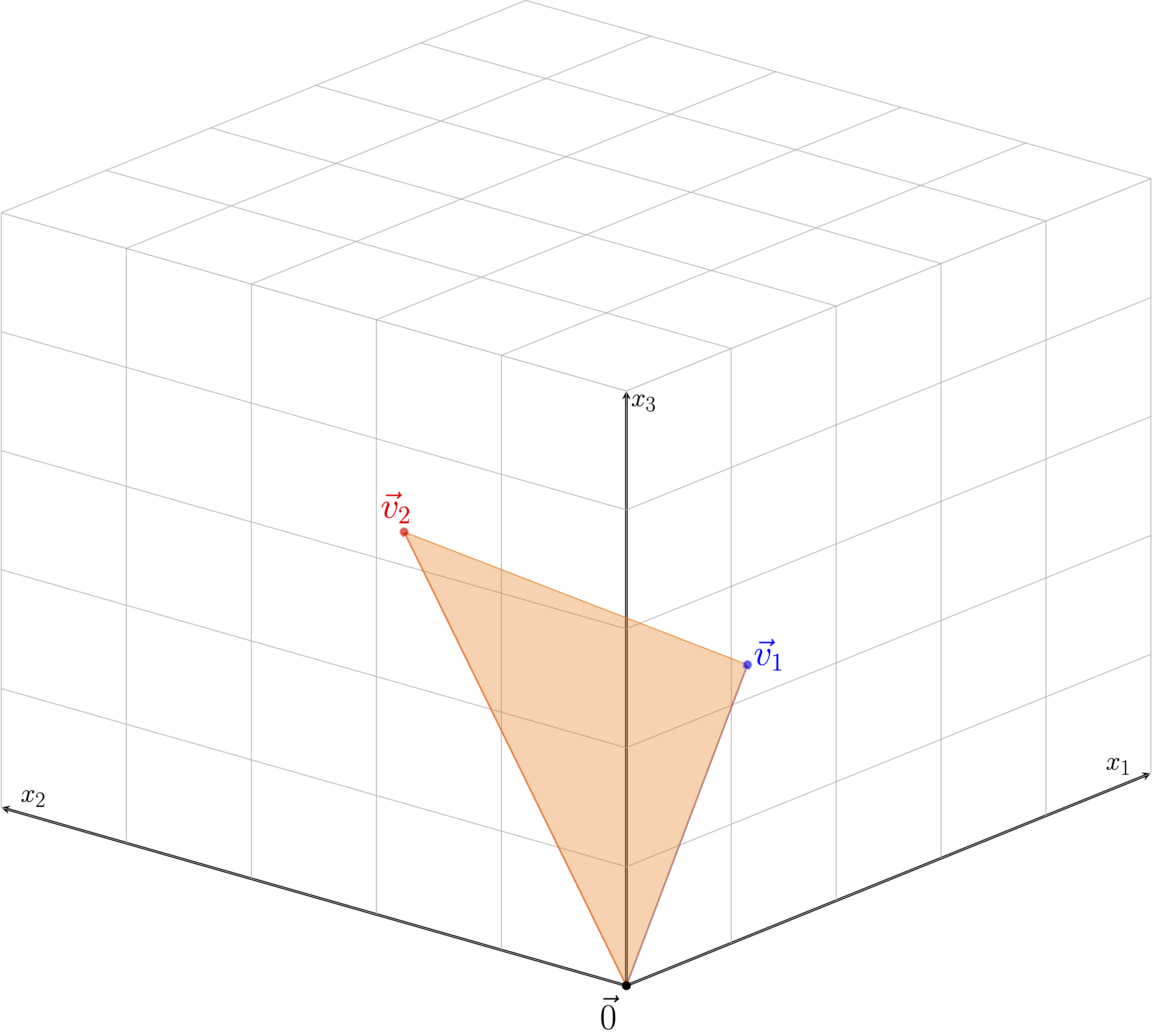 For a second example, take any two vectors \(\vec{h}_1\) and \(\vec{h}_2\) and consider there convex hull, that is \(\{a\vec{h}_1+b\vec{h}_2: a,b > 0, a+b\le 1\}\) such the orange triangle in the figure below. At the three vertices of the orange triangle, there is no local neighbor that looks flat. However, if we were to exclude the edges and vertices of the triangle, the subset would be a two-dimensional manifold; thus, \(\{a\vec{h}_1+b\vec{h}_2: a,b > 0, a+b< 1\}\) is a manifold while \(\{a\vec{h}_1+b\vec{h}_2: a,b > 0, a+b\le 1\}\) is not.
