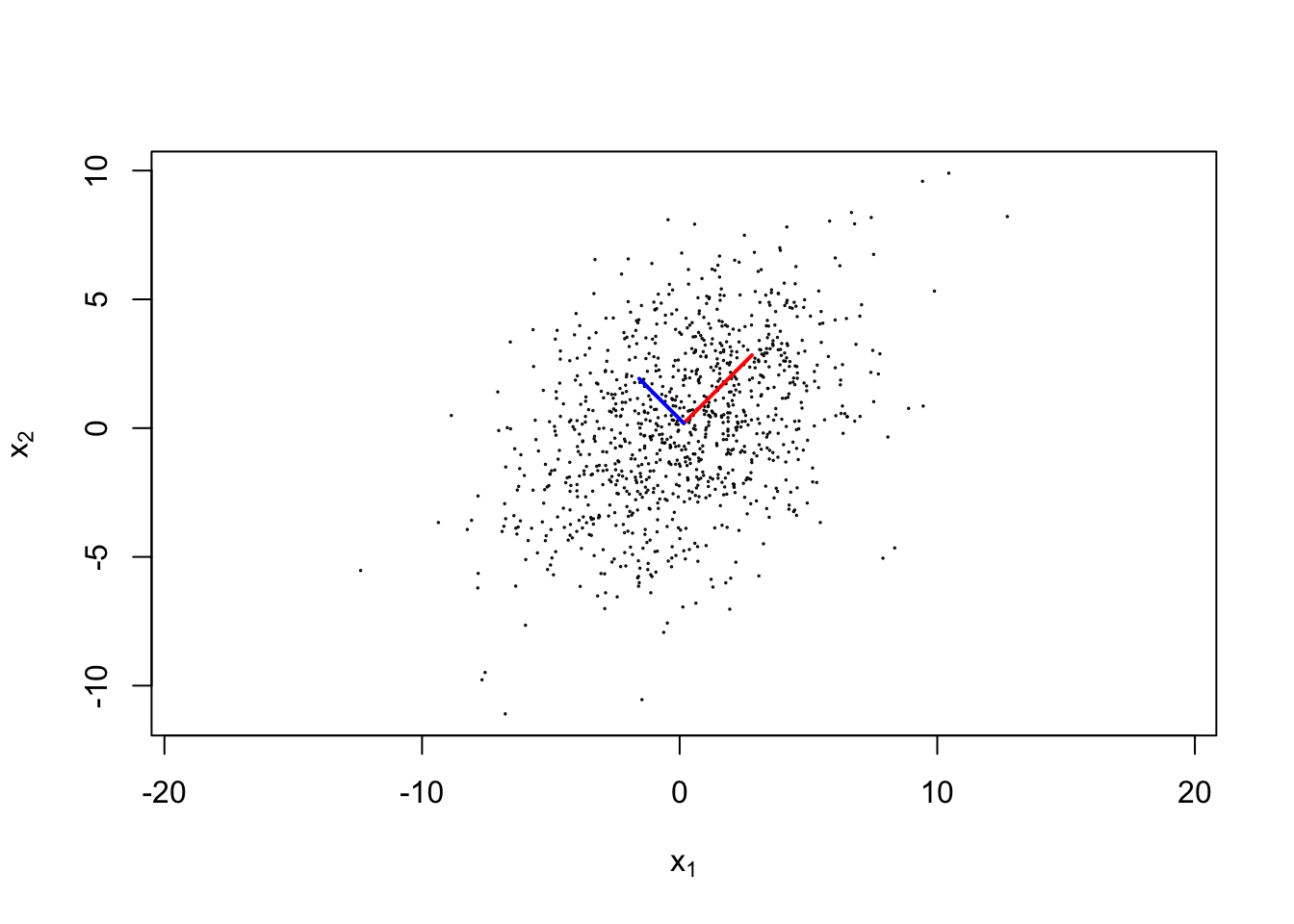 Example 2.4 (Level curves of MVN in) A scatterplot of 1000 iid samples from two-dimensional Gaussian distribution with mean \(\vec{0}\) and covariance \(\begin{bmatrix} 10& 2 \\ 2 & 10 \end{bmatrix}\) is shown below. The eigenvector associated with the largest eigenvalue of the sample covariance matrix is shown in red, whereas the eigenvector shown associated with the second eigenvalue is shown in blue. Note, both eigenvectors have been rescaled so their length is the square root of the associated eigenvalues.